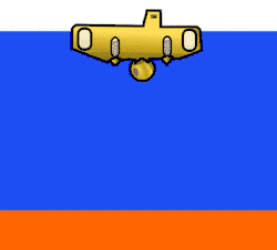 1. Das Benzin und die zu Beginn luftgefüllten Wasser-Ballasttanks sorgen für Auftrieb: Der Bathyscaph schwimmt.