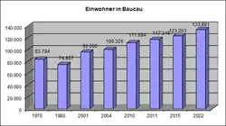 In der Gemeinde Baucau leben 134.878 Menschen (2022,[2] 2011: 117.348[10]). Von den Einwohnern sind 68.117 Männer und 66.761 Frauen. Auf 102 Männern kommen 100 Frauen[2] Zwischen 2015 und 2022 lag das jährliche Bevölkerungswachstum bei 1,3 %. Der Landesdurchschnitt liegt bei 1,8 %.[2] Zwischen 1990 und 2004 wuchs die Zahl der Einwohner Baucaus jährlich um 1,07 %. Allerdings wandern viele Einwohner in andere Landesteile aus, vor allem in die Landeshauptstadt Dili. Über 12.000 der Einwohner Dilis von 2004 wurden in Baucau geboren. Daher war in den ersten Jahren der Unabhängigkeit Osttimors die Einwohnerzahl Baucaus zeitweise sogar rückläufig.[11]
