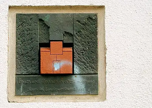 - ↑ Vergleiche zum Beispiel dieses Foto der Gebäudegruppe mit der integrierten Terrakotta-Installation „Bauen und Wohnen in alter Umgebung, Sieger im Landeswettbewerb 1983“