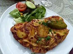Typische Beilagen für Bauernfrühstück sind Salate oder Gewürzgurken.