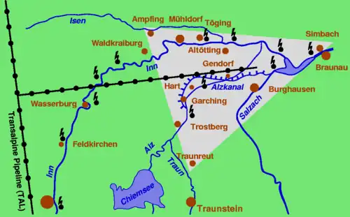 Ausschlaggebend für die Ansiedlung der ersten chemischen Großbetriebe ab 1908 waren die nutzbare Wasserkraft von Inn und Alz. Im Laufe der Zeit wurde eine Reihe von Laufwasserkraftwerke entlang des Inns (Liste hier) sowie am Alzkanal gebaut.[1]