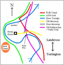 Beam House liegt etwa 2,4 km nordwestlich des Marktes Great Torrington am rechten Ufer des Torridge, fast ganz von der Flussschleife eingeschlossen. Der Beam-Steinbruch liegt in den klippengleichen Hügeln auf der anderen Flussseite. Als John Rolle, 1. Baron Rolle, den Rolle Canal zwischen dem Markt und dem schiffbaren Abschnitt des Flusses unterhalb des Dorfes Weare Giffard bauen ließ, wählte er Beam als Ort für die Überquerung des Flusses auf einem Aquädukt. Das Aquädukt wurde später aufgefüllt und dient heute als Straßenbrücke für die Zufahrt von der Straße A386 zu Beam House. Später kreuzte die Eisenbahn den Fluss etwas weiter flussabwärts und führte weiter nach Great Torrington über das Anwesen von Beam.