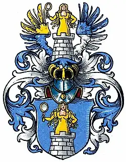 In Blau auf einem silbernen, schwarz ausgefugten Zinnenturm eine golden gekleidete Jungfrau, die in der Rechten einen goldenen Spiegel hält. Auf dem Helm das Wappenbild zwischen einem golden über blau und einem blau über silber geteilten Flügel. Die Helmdecken in blau-silber.