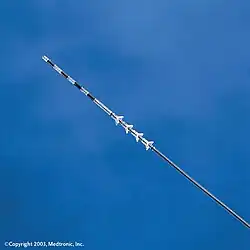 Es ist ein isolierter Elektrodendraht mit vier kombinierbare Kontaktflächen und vier weiche Gummi-Widerhaken zur Befestigung ins Neuroforamen. Die bestmögliche Platzierung der Tined-Lead-Elektrode ist der wichtigste therapeutische Schritt für den Erfolg der Methode.