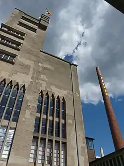 Der Turm wurde in den Jahren 1925–1931 nach Plänen des Stuttgarter Architekten Hans Herkommer gebaut. Herkommer war einer der bekanntesten Baumeister katholischer Kirchen im Deutschland der 1920er Jahre, entwarf aber auch Profanbauten. Der Beton-Turm ist im Stil des Neuen Bauens mit expressionistischen Elementen gestaltet und wurde zum Wahrzeichen der Mittelstadt St. Ingbert im heutigen Saarpfalz-Kreis. Der 42 Meter hohe Bau, der auf neun Geschossen die Maschinen, Apparate und Behälter des Produktionsprozesses nebst einem „Braustübel“ im obersten Stockwerk beherbergte, steht unter Denkmalschutz. Der Turm wurde in den 1990er Jahren aufwändig saniert, die Fassaden wurden restauriert.