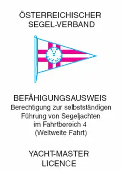 Als österreichische Befähigungsausweise für das Führen von Jachten gelten die vom Yachtsportverband und des Österreichischen Segel-Verband und vom Motorbootsportverband für Österreich für verschiedene Fahrtbereiche ausgegebenen Patente.[2][3] Die entsprechenden kleineren Führerscheine in Deutschland sind Sportbootführerscheine, in der Schweiz Schiffsführerausweise und im Vereinigten Königreich Yachtmaster.