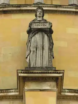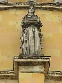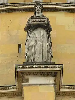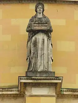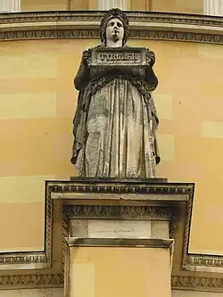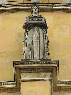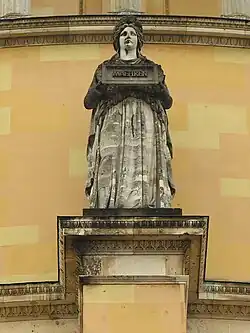 Die Höhe der Statuen beträgt jeweils 580 cm. Die im antiken Stil gewandeten, weiblichen Figuren wurden nach Modellen des Bildhauers Johann Halbig geschaffen und tragen in den Händen rechteckige Tafeln mit Inschriften in Majuskeln.