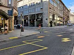 Eine Begegnungszone ist eine Form der Verkehrsberuhigung, in der Fußgänger gegenüber Fahrzeugführern vortrittsberechtigt sind.[1] Sie wurde ursprünglich in der Schweiz, inzwischen aber auch in anderen Ländern wie Belgien, Österreich, Frankreich und Luxemburg eingeführt. Sie zielt auf eine Steigerung der Straßenraumattraktivität und eine Erhöhung der Verkehrssicherheit ab,[2] indem die Wohn- und Geschäftsnutzung gegenüber der Verkehrsfunktion stärker gewichtet und die Aufenthalts- und Verkehrsbedingungen für den langsamen Verkehr verbessert werden.
