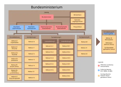 Die tragenden Organisationseinheiten der Bundes- und Landesbehörden sind bei obersten und oberen Behörden die Referate, welche teils Dezernate genannt werden. Diese können sich in Sachgebiete oder Teams gliedern. Sie werden von einem Sachgebiets- bzw. Teamleiter geführt. Mehrere Referate können zu einer Gruppe, zu einer Referatsgruppe oder zu einer Unterabteilung zusammengefasst werden. Mehrere Gruppen, Referatsgruppen oder Unterabteilungen bilden eine Abteilung. Bedeutende Abteilungen mit vielen Unterabteilungen werden auch Hauptabteilung genannt, z. B. die ehemalige Hauptabteilung Rüstung im Bundesministerium der Verteidigung. Die (Haupt-)Abteilung ist die höchste Gliederungsform unterhalb der Leitungsebene einer Behörde. Diese besteht aus dem Behördenleiter, seinen Stellvertretern und Stabsstellen. In Bundesbehörden werden die Behördenleiter oft Präsident, deren Stellvertreter Vizepräsident genannt. In Bundesministerien gehören zur Leitungsebene der Bundesminister, die Parlamentarischen und beamteten Staatssekretäre.