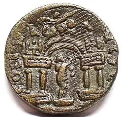 Münze aus Berytus zur Zeit Elagabals mit Tempel oder Stadttor und Silenus in der Mitte