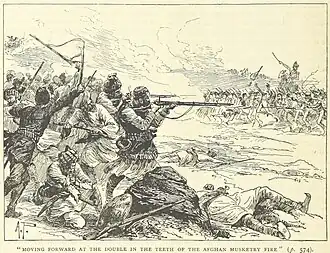![]() Britische Truppen (rechts) greifen die afghanische Linie an. | |||||||||||||||||