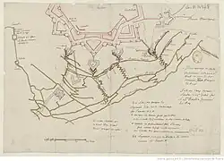 Die Franzosen schachteten den ersten Schützengraben in der Nacht vom 24. auf den 25. Juni aus, ohne dass die Belagerten dies sofort bemerkten. Mehrere Regimenter waren nacheinander an der Arbeit, Navarre, Sourches und Dillon, die am nächsten Tag von Médoc und Royal-Baviére abgelöst wurden, dann von Orléans, Tallard, Vermandois und Saintonge.[20]
