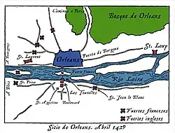 - Am 12. Oktober 1428 kam das englische Heer mit einer Truppenstärke von zehntausend Mann am linken Ufer der Loire an und schlug vor dem Fort Les Tourelles, gegenüber von Orleans, ein Lager auf, um die Franzosen vom linken Flussufer zu vertreiben. Nahe dem Kloster der Augustiner errichteten sie eine Schanze (Bastille), von der aus sie das französische Fort angriffen und am 21. Oktober vergeblich versuchten, es zu erstürmen.