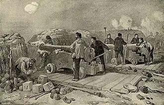 ![]() Geschützbatterie der britischen Marinebrigade vor Sewastopol, zeitgenössische Zeichnung von William Simpson | |||||||||