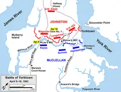 McClellan plante, die Konföderationstruppen mithilfe des 3. US-Armeekorps (Samuel P. Heintzelman) in ihren Stellungen festzusetzen und sie dann auf der linken Flanke mit dem 4. US-Armeekorps (Erasmus D. Keyes) zu umkesseln. Das Oberkommando der Union unterschätzte zu diesem Zeitpunkt noch die Länge der Warwick-Linie und nahm an, die Konföderation sei ausschließlich im direkten Umkreis der Stadt Yorktown selbst aufgestellt.[2]