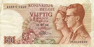 - ↑ Umtausch BEF und Darstellung der betreffenden Scheine auf nbb.be Abgerufen am 13. August 2022, (niederländisch).