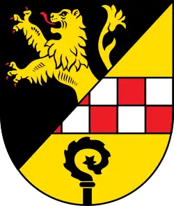 Blasonierung: „In schräg links gestelltem Schild vorne in Schwarz ein rotbewehrter und gezungter wachsender goldener Löwe, hinten in Gold ein von Silber und Rot in zwei Reihen geschachtelter Balken, unten wachsend ein schwarzer Krummstab.“ |