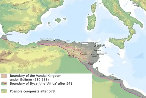 Außenpolitisch spielte Belisar nach dem vorläufigen Ende des Perserkrieges eine maßgebliche Rolle bei Justinians militärischen Interventionen im einstigen Westen des Imperium Romanum. Mit einem Heer von ca. 15.000 Mann (wobei unklar ist, ob sich diese Zahl einschließlich der inzwischen mehrere tausend Mann zählenden „Leibgarde“ Belisars versteht) setzte er 533 nach Africa über und vernichtete dort durch die Schlachten von Ad Decimum und Tricamarum mit Glück und völlig überraschend das Vandalenreich. Für diese Glanzleistung, die eine 175-jährige oströmische Herrschaft in Africa begründete, wurde ihm eine Art Triumphzug gewährt – der erste seit fast 500 Jahren, der nicht von einem Kaiser angeführt wurde –, allerdings musste Belisar, der sich in Karthago auf den Königsthron gesetzt hatte, vor dem Kaiserpaar niederknien. Offenbar sollte ihm seine Rolle als Nachgeordneter bewusst gemacht werden, der den Sieg lediglich im Namen des Herrschers errungen hatte. Jüngst ist überdies vorgeschlagen worden, dass die Zeremonie nicht nur die Ehrung, sondern zugleich auch die Erniedrigung des übermütigen Feldherrn zum Ziel gehabt habe (Börm 2013).