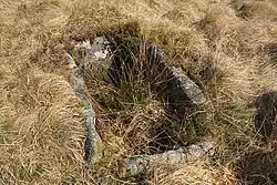 Abgesehen von einer einzigen Platte der Steinkiste ist dieser Cairn all seiner Steine beraubt.
