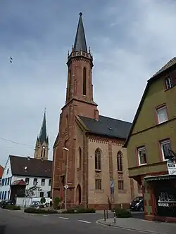 Nördlich des Ortes befinden sich die Reste des Jagdschlosses Friedrichsbühl. Im Zentrum des Ortes erhebt sich die katholische Kirche St. Nikolaus. Ihr Turm stammt aus dem 15. Jahrhundert und wurde im 19. Jahrhundert erhöht. Er ist 68 Meter hoch. Die Protestantische Kirche steht ungefähr 50 Meter weiter östlich und ist nach Norden gerichtet. Ihr Turm ist 42 Meter hoch.