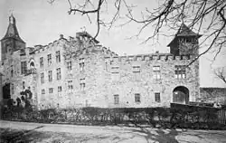 Rechts vom Treppenturm aus reduziert sich die Etagenzahl wieder der Hofkontur folgend von fünf auf ein Geschoss und endet vor dem rechten der beiden Türme am Ausgangspunkt. Mit diesem verschmolzen erfolgt noch eine kleinere Fortsetzung der Bebauung außerhalb des Innenhofes in Form einer Hausmeisterwohnung und weiteren Nebenräumen.