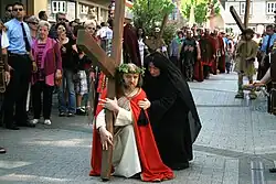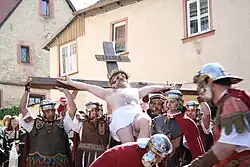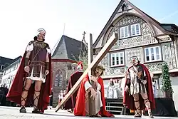- ↑ Günter Schenk: Christliche Volksfeste in Europa. Innsbruck 2006, S. 50 f.: Christi Leiden in der Fußgängerzone. Ein Passionsspiel vereint Christen aller Konfessionen. ISBN 978-3-70-222777-7