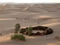 Viele Touristen verbringen im Süden Marokkos eine Nacht in einem Zeltcamp in der Wüste. Die hier zur Verfügung gestellten Zelte sind jedoch oft neuzeitliche Fabrikate und haben mit den traditionellen Berberzelten nichts mehr zu tun.