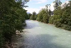Die Berchtesgadener Ache ist ein selbst etwa 18 km, zusammen mit ihrem längsten Oberlaufstrang etwa 39 km langes Alpengewässer im Südostzipfel Bayerns, das in der Berchtesgadener Talspinne aus der Vereinigung von linker Ramsauer Ache und rechter Königsseer Ache entsteht und mit nordöstlichem bis nördlichen Lauf zur Salzach fließt. In Österreich, wo sie im Land Salzburg nach kurzem Unterlauf nahe der Halleiner Siedlung Rif von links mündet, wird sie mit Einschluss ihres rechten Oberlaufs Königsseeache genannt,[5] auch Alm oder Almbach. Um 1815 wurde der Fluss noch als Albe,[6] laut einer Forschungsgruppe der Universität Salzburg auch als Niedere Albe bezeichnet (vergleiche dazu auch die Bezeichnung der an dem Fluss liegenden Ortschaft Niederalm in Anif sowie Obere Albe für den südlich davon ebenfalls in die Salzach abfließenden Almbach mit Bezug zu Oberalm).[7]