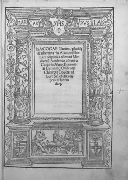 1521 verfasste er eine sehr ausführliche Anatomie und im folgenden Jahr das anatomische Lehrbuch Isagoge, das unter anderem die Gießbeckenknorpel (Stellknorpel)[1] des Kehlkopfes, den Wurmfortsatz des Blinddarms,[2] das Herz und seine Koronararterien[3] darstellt, sich aber noch auf die Anathomia seines Vorbildes, Mondino dei Luzzi, stützt. Er hing noch sehr der Autorität Galens an und übernahm zum Teil dessen Irrtümer.