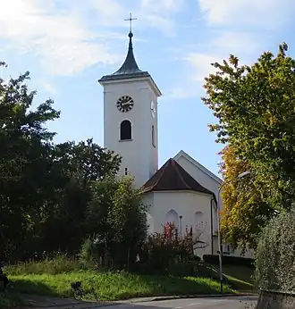 Die Pfarrkirche liegt landschaftsbildprägend auf einer Anhöhe. 1252 erstmals erwähnt, wurde sie 1464 neu errichtet, im Dreißigjährigen Krieg 1646 durch Brand zerstört, bis 1662 wiederaufgebaut und 1793 und 1837 umgebaut. 1894–1897 wurde die barocke Ausstattung aus dem frühen 18. Jahrhundert durch eine komplette historistische Ausstattung im Stil der Neurenaissance (u. a. von Moriz Schlachter) ersetzt. Im Zweiten Weltkrieg wurde die Kirche beschädigt und bis 1946 repariert. In den Jahren 1970 und 1971 wurde das Innere in zeitgenössischem Stil neugestaltet, wobei die historistische Ausstattung vollständig entfernt wurde. - Pfarrhaus: Baujahr 1785