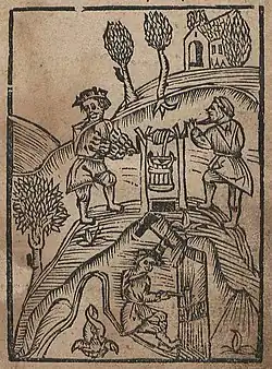 Darstellung des Bergbaus von 1527, unten der Hauer im Schacht, oben die Haspelknechte