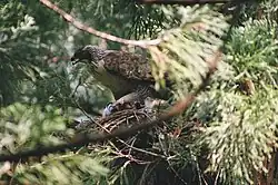 Die Paare scheinen ganzjährig in den Revieren präsent zu sein. Der Beginn der Balz ist unbekannt; der Balzflug besteht aus hohem Kreisen und Wellenflügen über dem Nestbereich, dabei wird intensiv gerufen. Die Nester werden auf großen Bäumen im Wald errichtet, der Nestdurchmesser beträgt bis zu 1,8 m, die Nesthöhe 0,9–1,2 m. Die Nestmulde wird mit grünen Zweigen ausgelegt. Die Eiablage erfolgt im größten Teil des Verbreitungsgebietes ab Ende Januar oder Februar, nur auf Sri Lanka bereits ab Dezember. Das Gelege besteht meist aus ein bis zwei, sehr selten aus drei Eiern. Brutdauer und Nestlingszeit sind unbekannt. Die Jungvögel werden offenbar erst sehr spät selbstständig; bei in Japan untersuchten Brutpaaren verließen die Jungvögel das elterliche Revier erst nach 2 bis 3 Jahren.[11]