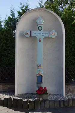 Als Baudenkmal unter Denkmalschutz stehen zwei Wegekreuze. Das ältere der beiden (Ecke Goldbergweg/Berghausener Straße) ist ein Missionskreuz aus dem Jahre 1734 und wurde 1983 erneuert. Es ist aus Eichenholz beschaffen, enthält eine Passionsdarstellung und steht in einer Rundbogennische aus Beton, die dem Witterungsschutz dient und bei der Erneuerung entstand. Es gilt als eines der ältesten erhaltenen Holzkreuze der Region. Das jüngere Kreuz (Bitzerweg 19), ein geschnitztes Holzkreuz mit Schutzbedachung, geht auf das Jahr 1828 zurück und zeigt ebenfalls Symbole für das Leiden Christi.[13]