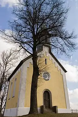 Die Saalkirche wurde 1852 errichtet. Sie besteht aus einem Langhaus mit einem Fries in Form einer Zinne, das im Osten halbrund geschlossen ist. Über dem Giebel ihrer Fassade im Westen, in dem sich das Portal befindet, erhebt sich ein quadratischer Dachreiter, der den Glockenstuhl mit zwei Kirchenglocken beherbergt und der mit einem Faltdach bedeckt ist.