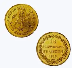 1. Das Bild wurde nachträglich eingefärbt. Foto der Münzen in Mirco Brunner: Die Goldene Sonne am Calanda. Maturaarbeit. Bern 2007, OCLC 759621160.