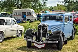 Berliet 11CV Dauphine: Der Typ kam ab 1934 neu hinzu und lief werksintern jetzt unter der Bezeichnung VIRS-11. Der wassergekühlte Vierzylindermotor des Typs MKM (Kopfventile) 80 mm Bohrung und 99,6 mm Hub (Hubraum 2003 cm³) (bisweilen auch fälschlich mit 80×100 mm angegeben)[A 1] hatte 11 Steuer-CV und 50 effektive PS bei 4000/min. Der Radstand betrug 3,06 m. Der Wagen war mit einer Schneckenlenkung ausgestattet. Die Vorderradaufhängung war jetzt mit unabhängigen Rädern an einer Querblattfeder. Die Spur maß 1,35 m. Die Höchstgeschwindigkeit wird mit 110 km/h angegeben.[8] Das Fahrzeug war in folgenden Varianten lieferbar: