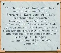 Prinz Friedrich Karl erwarb 1859 Bauernländereien von Zehlendorf und Großmachnow und erbaute darauf das Jagdschloss Dreilinden. 1865 wurde es zum Andenken an die Erstürmung der Düppeler Schanzen zu einem Gutsbezirk zusammengefasst und erhielt den Namen Düppel. 1927 kaufte die Stadt Berlin das Rittergut Düppel zu Siedlungszwecken (Kaufpreis: elf Millionen Mark; kaufkraftbereinigt in heutiger Währung: rund 48,9 Millionen Euro).[15] Im Wirtschaftsjahr 1931/32 war das Gut Düppel eines von 41 Gütern der Berliner Stadtgüter.[16]
