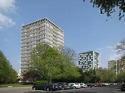 • Die zweite Gruppe ist die der Zeilenbauten. Sie haben den Grundriss eines langgezogenen Rechtecks und bestehen aus vier bis zehn Geschossen. Zeilenbauten mit nur vier Geschossen waren besonders kostengünstig – spezielle Bautechnik wurde nicht benötigt, auf Aufzüge konnte verzichtet werden. Allerdings war die Flächennutzung (das Verhältnis von Wohnfläche zu Grundstücksfläche) nicht optimal, die Gebäude mussten ziemlich eng beieinander stehen, der Gesamteindruck ist etwas monoton.