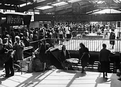 Der Bahnhof Ausstellung ging am 10. Dezember 1928 in Betrieb. Während die Stadtbahnsteige von Beginn an von elektrischen Zügen befahren wurden, verkehrten auf dem Ringbahnsteig noch bis zum 18. April 1929 ausschließlich dampfbetriebene Züge.[8] Werktags wurde mit 16.000 bis 20.000 Fahrgästen im Umsteigeverkehr zwischen Stadt- und Ringbahn gerechnet, täglich hielten etwa 700 Züge am Bahnhof.[7] Nach einer möglichen Ausdünnung des Verkehrs über die Nord- und Südringkurve wurde mit bis zu 50.000 Fahrgästen gerechnet. Hinzu kamen nochmals 50.000 Fahrgäste, die bei Messen erwartet wurden.[5] Am 15. Januar 1932 folgte die Umbenennung in Westkreuz.[9][10]