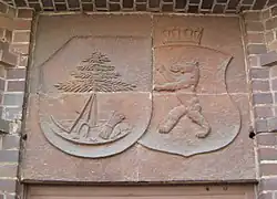 Wappen von Wittenau (links) und Berlin (rechts) über dem Hauseingang Oranienburger Straße 186, entstanden um 1927