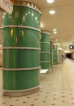 Der unter dem Bahnsteig der Linie U2 liegende Bahnsteig der Linie U9 unterquert den gesamten Bahnhofsvorplatz annähernd parallel zum Fernbahnhof. Diese am 28. August 1961 eröffnete Station für das Großprofil besitzt einen Mittelbahnsteig mit einem Ausgang an der Nordseite. Zudem gibt es den Hauptausgang an der Südseite, wo Verteilerhallen existieren, die sich auf der Ebene der U2 befinden und auf dieser Linie die westliche Vorhalle darstellen. Sie wurden im Rahmen des Baus der U9 großzügig erweitert.[35] Die gefliesten Wände des Bahnhofs sind mit Darstellungen von Tieren geschmückt, um den Bezug zum naheliegenden Zoo herzustellen. Beide U-Bahnhöfe liegen L-förmig zueinander und sind mit Aufzügen barrierefrei erreichbar.