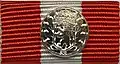Die Bandschnalle zum Ehrenzeichen ist in der gleichen Farbgebung und mittig ist in Miniatur die silberne Medaille eingearbeitet.