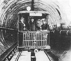 Im Jahr 1891 legte die AEG Pläne für den Aufbau eines Schnellbahn-Netzes in Berlin vor. Im Gegensatz zum 1888 von Siemens & Halske eingereichten Vorschlag einer Hochbahn favorisierte die AEG eine Untergrundbahn. Der Berliner Magistrat hielt das sandige Erdreich unterhalb der Reichshauptstadt jedoch für ungeeignet und stoppte zunächst das Vorhaben.[1] Nach Verhandlungen einigten sich beide Seiten zur Anlage eines Probetunnels unter dem Spreebett im Treptower Park.[2] Unter Beteiligung von AEG, der Deutschen Bank und der Philipp Holzmann AG wurde 1894 die Gesellschaft für den Bau von Untergrundbahnen GmbH ins Leben gerufen.[2]