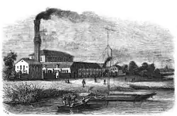 Die englischen Unternehmer Charles Fox und Thomas Russel Crampton erhielten 1852 den Auftrag zur Wasserversorgung Berlins, während die Abwasserentsorgung nicht Teil des Auftrags war. Der Vertrag, dessen wesentliche Inhalte von König Friedrich Wilhelm IV bestimmt wurden, hatte eine Laufzeit von 25 Jahren. Mitgestaltungsmöglichkeiten der Stadtverwaltung waren darin nicht vorgesehen, die Gewinne, die durch die Wasserpreise reguliert wurden, durften 15 % nicht übersteigen und die preußische Regierung gewährte den Unternehmern „besonderen Schutz in allen Angelegenheiten“. Der Polizeipräsident Karl Ludwig Friedrich von Hinckeldey fungierte als der Vertragspartner von Fox und Crampton.[7][8] Crampton und William Whitaker Collins planten die Anlage,[9] deren Bau 1853 unter der Leitung des englischen Ingenieurs Henry Gill begann. Im selben Jahr gründeten die Unternehmer die Berlin Waterworks Company, die 1853 den Grundstein für das erste Berliner Wasserwerk vor dem Stralauer Tor legte.[8] Am 1. Juli 1856 nahm es seinen Betrieb auf,[6] ein Jahr später waren bereits 341 Häuser, hiervon 314 Privathäuser, an die Wasserversorgung angeschlossen.[10] Bis 1859 erhöhte sich die Anzahl auf 1.141 Häuser, was dem Unternehmen erstmals einen kleinen Gewinn einbrachte. Ab 1868 zahlte die Gesellschaft Dividenden von über neun Prozent aus.[6]
