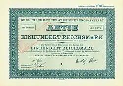 - ↑ Berlinische Feuer-Versicherungs-Anstalt. Abgerufen am 13. Januar 2024 (historische alte Aktien und Wertpapiere, Sammleraktien von HAHN).