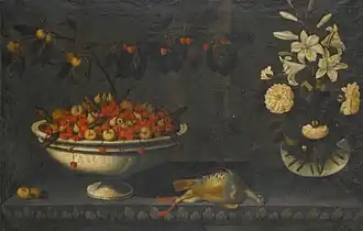 - Weiße Keramikschale mit Kirschen, Pfirsichen, Aprikosen und Erbsenschoten, 49 × 74 cm, früher Privatsammlung, Bergamo (ehemals dem “Maestro del Frutero Lombardo” zugeschrieben)