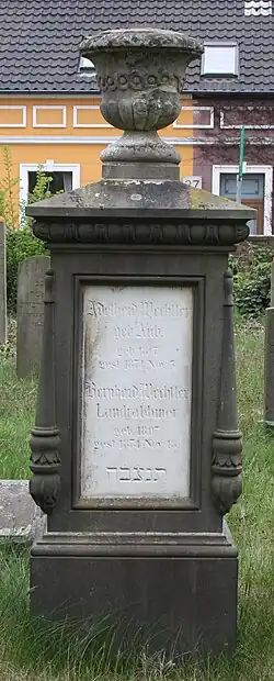 „Ein hochgestellter Quader wird an den Ecken von umgedrehten und erloschenen Fackeln gerahmt. Die Oberkante säumt ein Eierstab. Gekrönt wurde der Stein ursprünglich von einer steinernen Vase. Klassizistischer Zierat ohne Protz. Die Inschrift lautet: ‚Adelheid Wechsler geb. Aub. geb. 1817 gest. 1874 Nov. 5. Bernhard Wechsler Landrabbiner geb. 1807 gest. 1874 Nov. 18. T.N.Z.B.H.‘ Die letzten Buchstaben sind in hebräisch eingemeißelt. Sie bilden die Anfangsbuchstaben der Worte einer rituellen Formel, die unterschiedlich übersetzt wird: ‚Ihre Seele sei eingebunden in den Bund des Lebens‘ oder auch: ‚Ihre Seele sei aufgenommen im Bund der Ewigkeiten‘. Dieser Segenswunsch ist für jüdische Grabsteine so gut wie obligatorisch. Hier sind sie die einzigen hebräischen Sprachzeichen auf einer ansonsten deutschen Inschrift, die keine weiteren Aussagen über die hier Ruhenden macht. Mit der deutschen Sprache, der christlichen, d. h. offiziellen Zeitrechnung und der Kargheit der Inschrift fügt sich der Grabstein in die Reihe der anderen ein, die in dieser Zeit gesetzt wurden. Sie alle bezeugen die Selbstverständlichkeit der Zugehörigkeit zur Gesellschaft dieser Zeit.“[5]