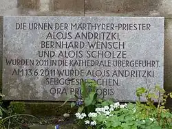 Priestergruft mit dem Grab von Bernhard Wensch auf dem Alten Katholischen Friedhof in DresdenGedenktafel zur Erinnerung an die sorbischen Märtyrer am vormaligen Grab