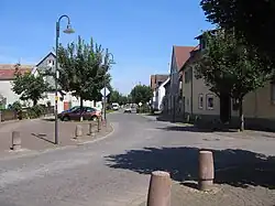 Die Kirche, erbaut in der ersten Hälfte des 11. Jahrhunderts, und ihr mächtiger Turmhelm prägen noch immer das Ortsbild, verstärkt durch den Geländesprung an der Oberpforte, der sich weiter bis zur Kirche fortsetzt und erneut 5 m – 10 m überwindet.[20] Die Kirche wurde im 11. Jahrhundert erstmals erwähnt. Nördlich an Kirche und Pfarrhof schließt der Mainzer Hof an. Er bildete zusammen mit der Kirche und dem Tanzhof den historischen Ortskern.[21] Daran grenzt seit dem Spätmittelalter im Westen das ehemalige Gemeindewirtshaus an der Oberpforte. Bis ins 18. Jahrhundert bildeten Pfarrhof und Gemeindewirtshaus eine bauliche Einheit.