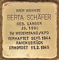 Berta Schäfer zog zusammen mit ihren Eltern 1905 nach Gera. Hier arbeitete sie in verschiedenen Industriebetrieben. Schäfer engagierte sich politisch und gehörte dem Jung-Spartakus-Bund, dem Bund der Freunde der Sowjetunion sowie der Roten Hilfe an. Mit ihrem späteren Mann war sie in der KPD aktiv. Mit ihm hatte sie zwei Töchter. Während der NS-Zeit wurde der Familie 1934 aufgrund einer nach den Nürnberger Gesetzen festgestellten jüdischen Linie die Staatsbürgerschaft entzogen. Auch verlor ihr Ehemann im Zuge von Säuberungsaktionen seine Stelle als Krankenpfleger am städtischen Krankenhaus. Dem ständigen Druck, sich von seiner jüdischen Frau scheiden zu lassen, widerstand er während der gesamten NS-Zeit. Ständige Hausdurchsuchungen, Arbeitslager und Zwangsarbeit waren noch die kleineren Übel, die ihre Familie durchzustehen hatte. Eine ihrer Töchter, die von einem „Arier“ ein Kind bekommen hatte, wurde wegen dieses Verbrechens – Rassenschande – ins Konzentrationslager gebracht und kehrte 1945 krank zurück. Berta Schäfer selbst kam im September 1944 ins KZ Ravensbrück, wo sie am 11. Februar 1945 den Tod fand.